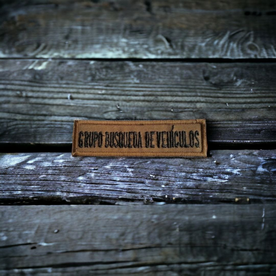 Parche color ocre del Grupo Búsqueda de Vehículos, el cual es utilizado para colocarse en mochilas tácticas, chaquetas tácticas, gorro táctico y cualquier accesorio que mantenga velcro.