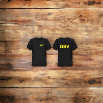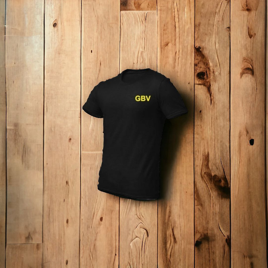 Polera con diseño bordado de las letras GBV en color amarillo parte delantera altura del pecho y con diseño bordado de las letras GBV altura de la espalda.