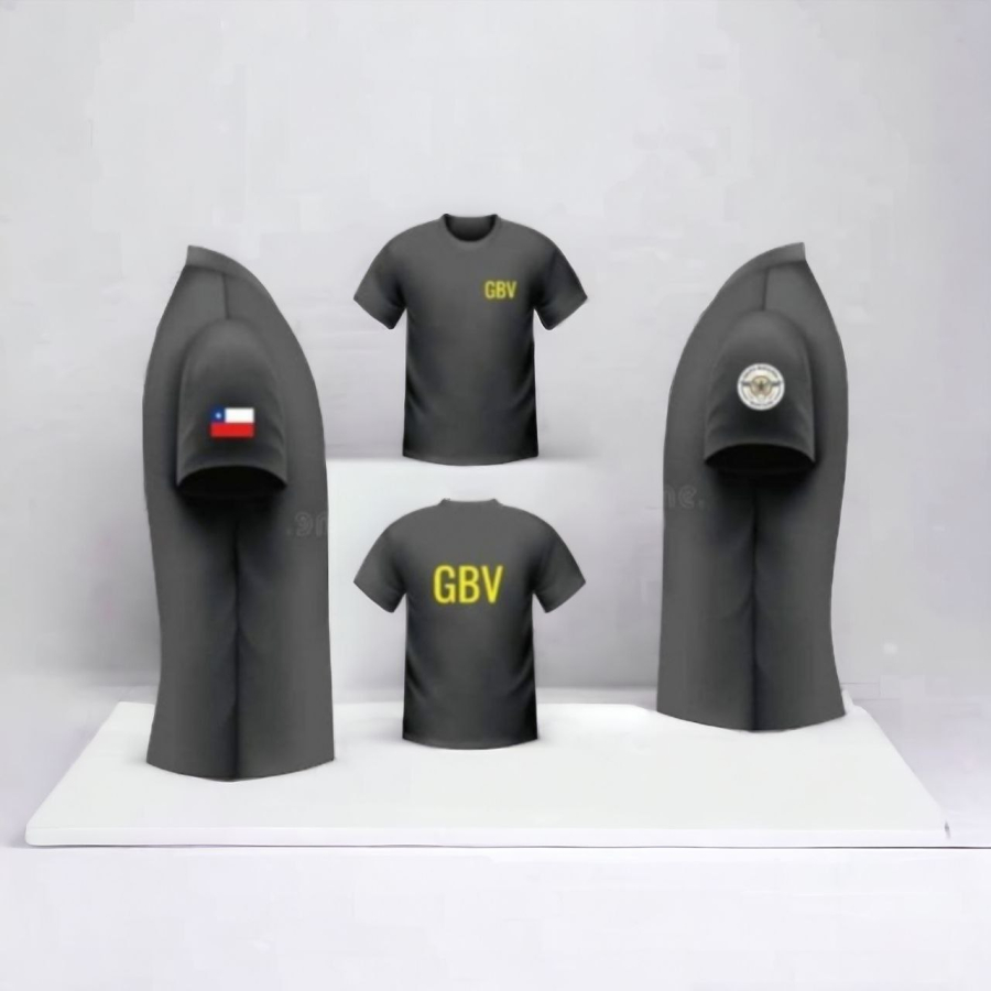 Polera cuello redondo, con cuatro diseños estampados de uso especial para patrulleros y administrativos del GBV. Material de la polera es 100% algodón. Estampados de confecciones industriales. Bandera Chilena brazo izquierdo. Escudo GBV brazo derecho. Letras GBV altura del pecho, costado izquierdo. letras GBV espalda.